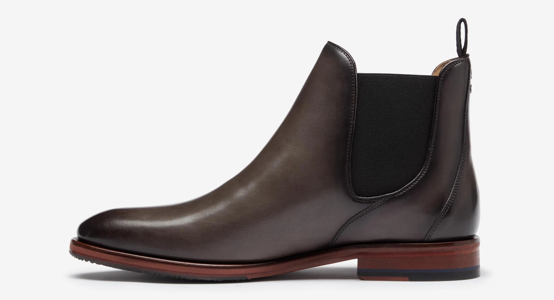 Our classic Chelsea boot is made from smooth Dark Brown Adigo calf leather with contrasting khaki elastic gussets, a fabric back pull tab and a neatly piped topline. We’ve included a ½ calf leather lining and cushioned leather heel pad. The upper is Blake stitched to a leather sole with our signature fingerprint rubber top-piece and a rubber insert in the leather stack heel, for extra practicality.