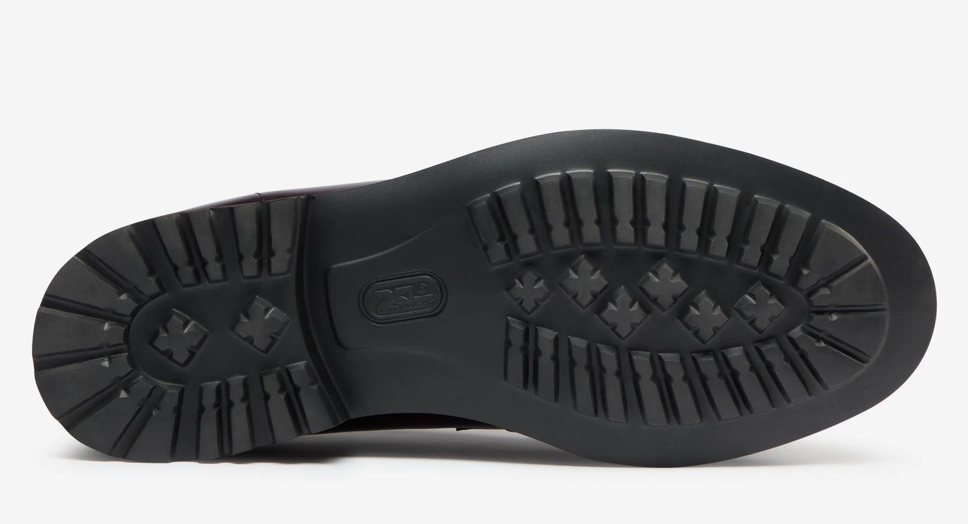 Our long-awaited Goodyear welted loafer is made from black hi-shine calf leather antique finished by hand. The classic penny loafer style has an overlaid apron seam and the traditional saddle with penny cut out. Inside we’ve included a full calf leather lining with a half leather insock cushioned at the heel. The upper is set on a fairly wide toed last and Goodyear welted to a leather sole. Finally it is cemented to a deceptively light, chunky outer sole with inset cleats at the forepart, made from a super lightweight but durable compound.