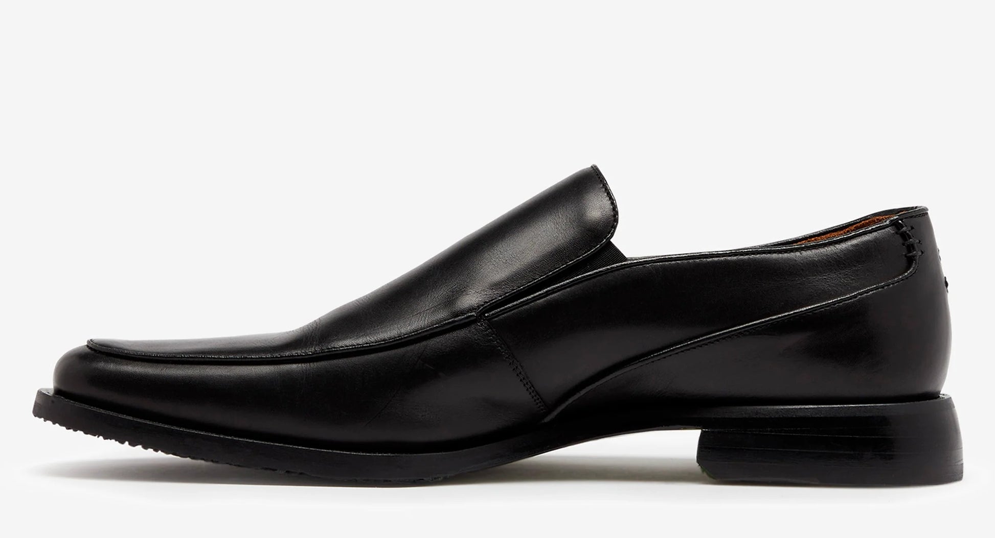 Our long-awaited Goodyear welted loafer is made from black hi-shine calf leather antique finished by hand. The classic penny loafer style has an overlaid apron seam and the traditional saddle with penny cut out. Inside we’ve included a full calf leather lining with a half leather insock cushioned at the heel. The upper is set on a fairly wide toed last and Goodyear welted to a leather sole. Finally it is cemented to a deceptively light, chunky outer sole with inset cleats at the forepart, made from a super lightweight but durable compound.